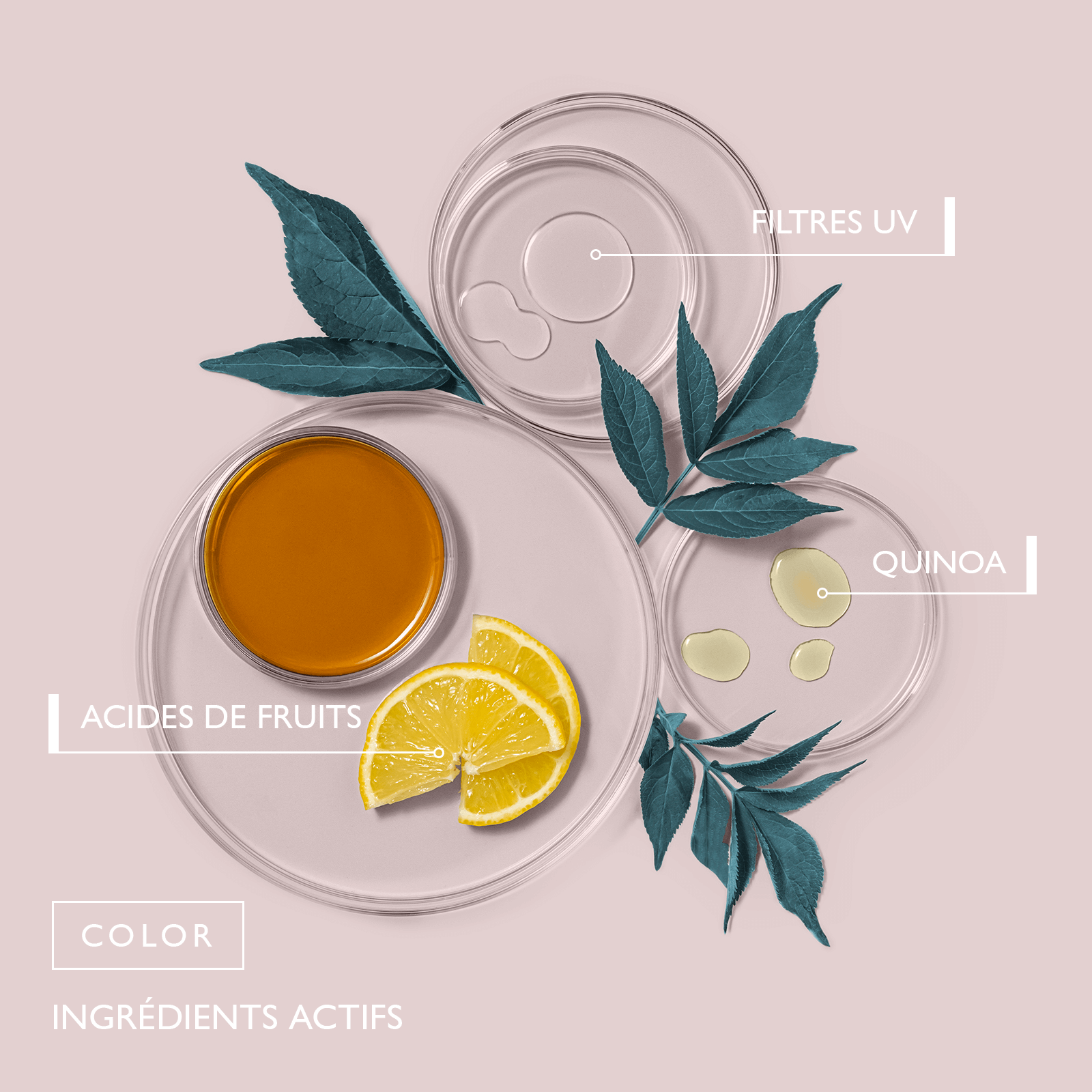 La structure de la protéine de quinoa continent les 8 acides aminés les plus importants pour vos cheveux. Ils s’attachent au cuticule et permettent d’ancrer la concentration de pigments colorés. Ils permettent de capturer la couleur et de limiter le dégorgement. Le quinoa est un ingrédient incroyable pour donner plus de brillance. La noix verte permet de garder l’éclat de votre couleur plus longtemps et surtout de protéger vos cheveux des agressions environnementales. Les acides de fruits permettent de resserrer le cuticule, de protéger la disparition des pigments et d’améliorer la brillance grâce à un effet protecteur contre le calcaire et le sel de mer.