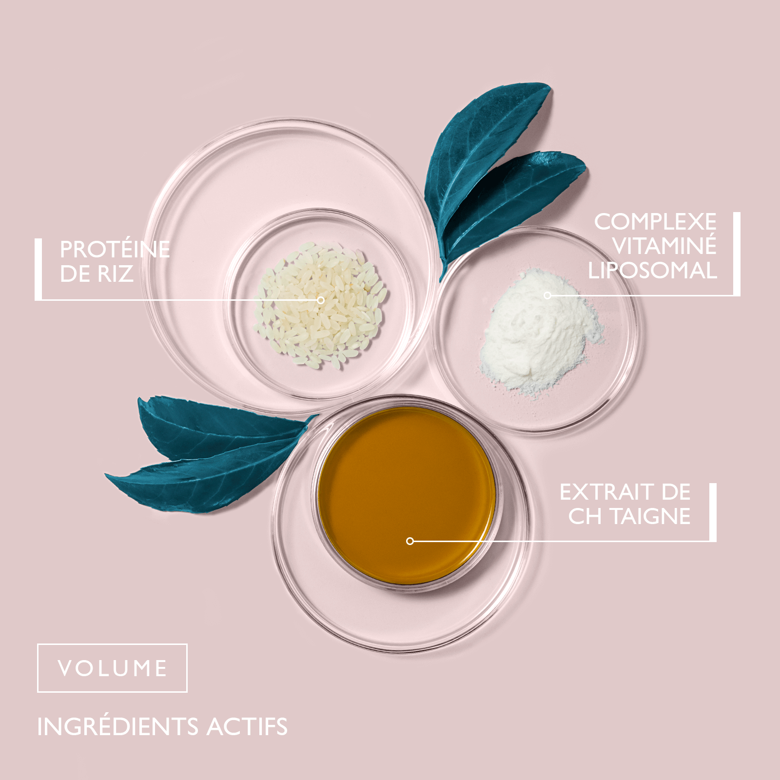 Les protéines de riz possèdent également des propriétés nourrissantes et protectrices exceptionnelles. Si vos cheveux manquent de volume, il est important de les protéger et de les nourrir. C’est pourquoi, nous avons choisi des ingrédients puissants, comme l’extrait de châtaigne, qui vont enrober votre cheveu d’un film naturel protecteur, maintenir un niveau d’hydratation optimale et favoriser la réflexion de lumière et donc apporter de la brillance à vos cheveux.Nous avons également ajouté des vitamines pour renforcer vos cheveux grâce un complexe de liposomes. Le résultat: des cheveux en pleine santé, qui brillent, avec du volume et qui sont faciles à coiffer!