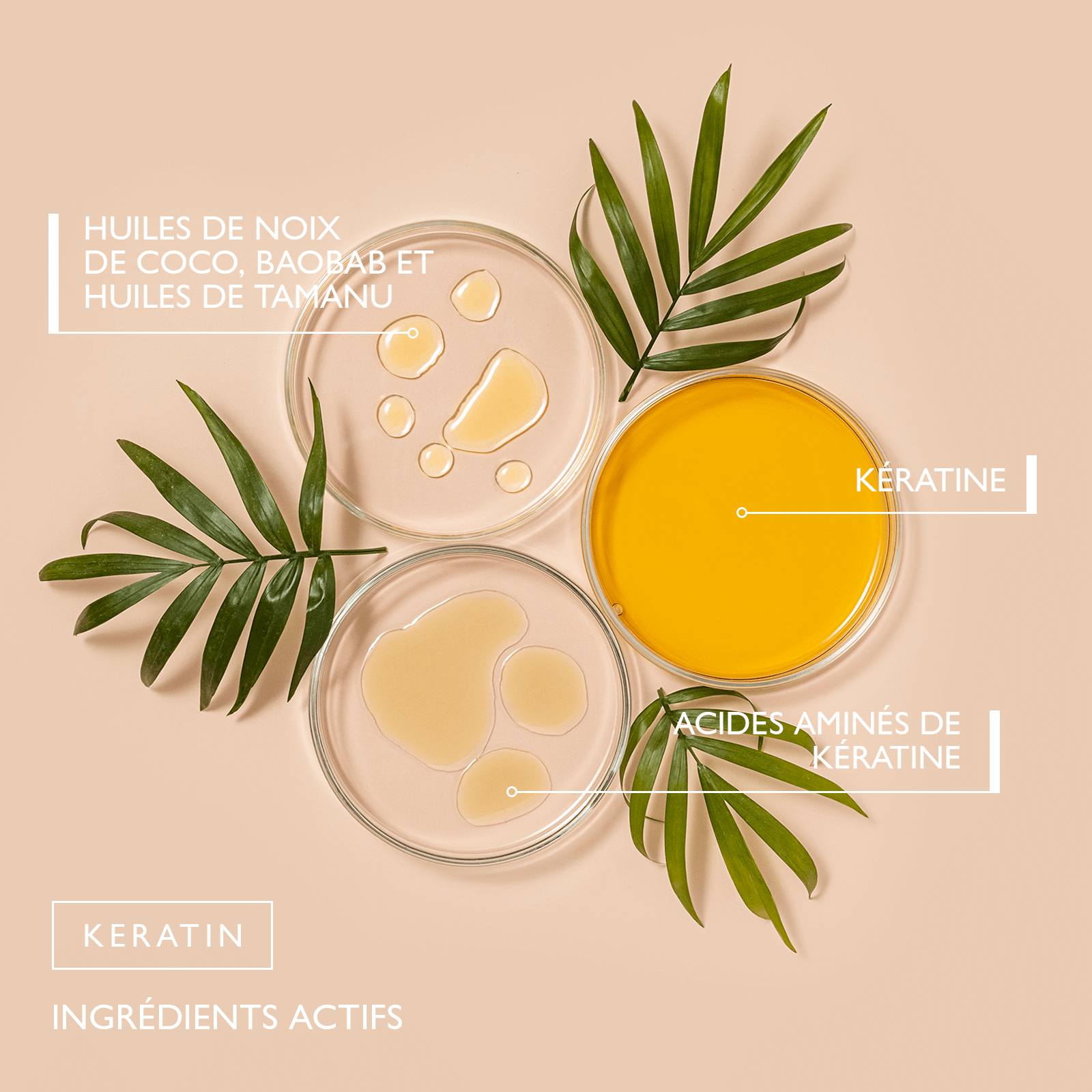 La kératine est la structure principale de la protéine fibreuse des cheveux. Nos cheveux possèdent 3 couches différentes: la moëlle, le cortex et la cuticule. La cuticule est la couche externe, composée de cellules en forme d’écailles. Ces cellules protègent et limitent les dommages de la structure interne et contrôlent le niveau d’eau contenu dans la fibre capillaire. Le cortex est la structure centrale composée de fibres de protéines provenant de la kératine ou d’autres protéines qui apportent de la force, de la texture et de l’élasticité. Des traitements chimiques répétés, des mauvaises habitudes de coiffage ou des dommages causés par l'environnement extérieur peuvent altérer la stabilité du cheveu et l'abîmer considérablement (causant par exemple des frisottis ou des nœuds). La cuticule et le cortex ont tous les deux besoin d’un renouvellement de kératine à différents niveaux. Notre formule combine deux types de kératine moléculaire pour un renouvellement instantané et à plus long terme. Elle est enrichie en huiles triglycérides pour booster la couche protectrice naturelle de lipides, protégeant ainsi vos cheveux du dessèchement, de la casse et de l'électricité statique.
